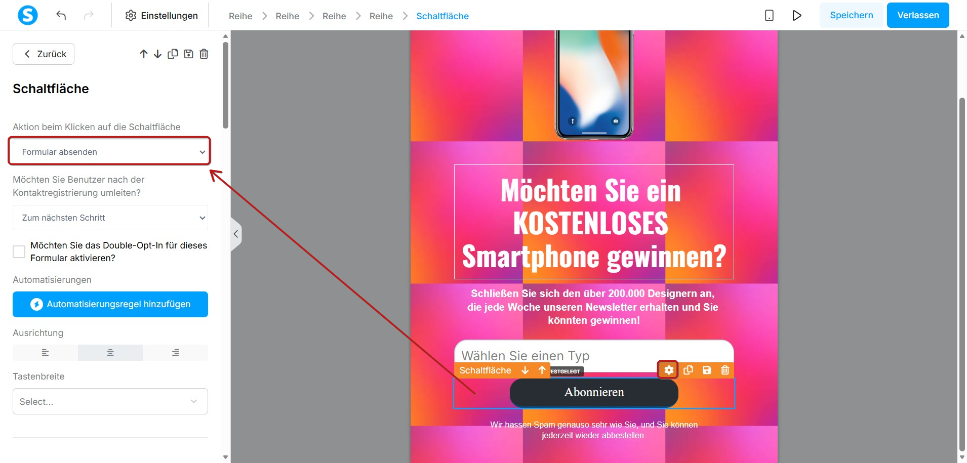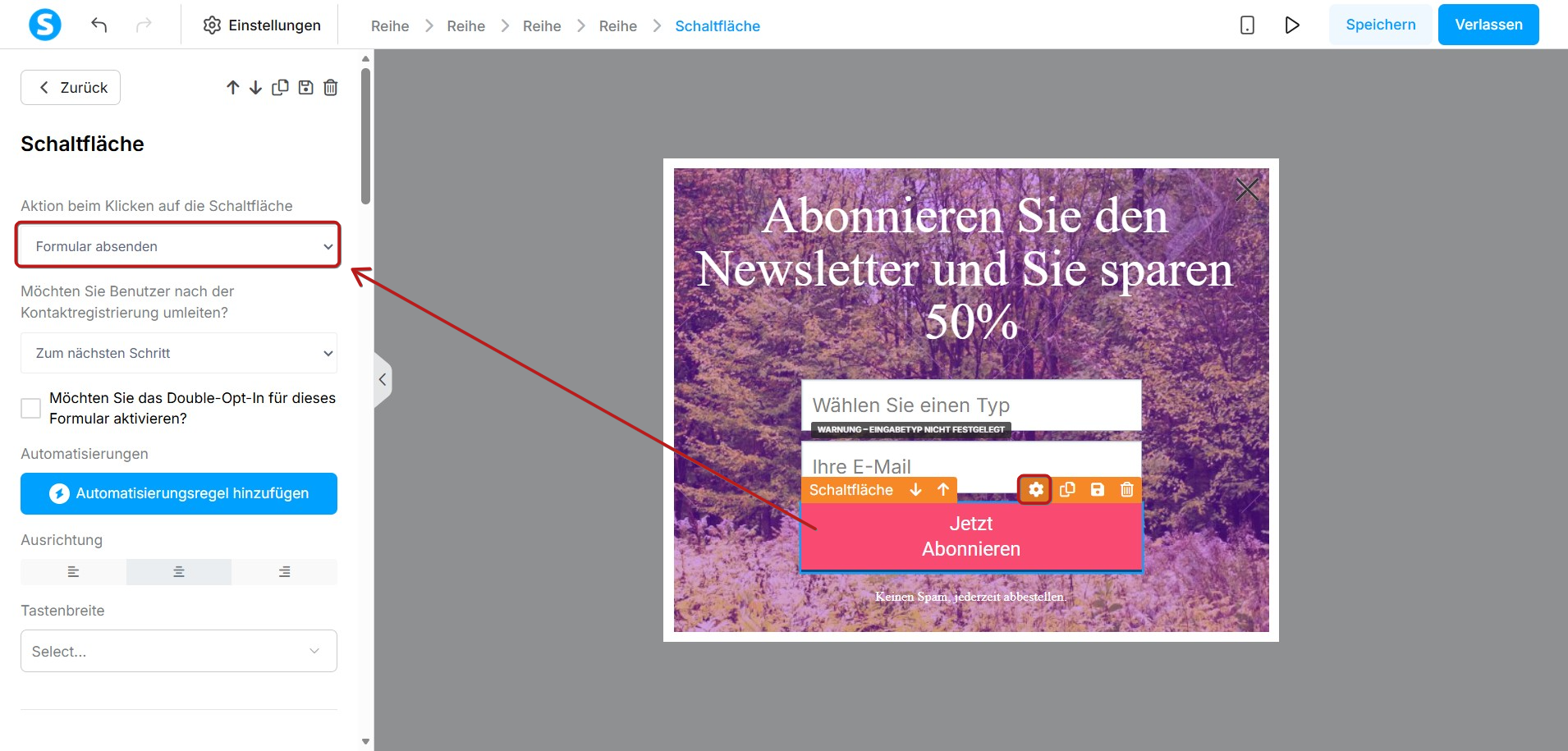Sie müssen außerdem die Button-Aktion konfigurieren. Wählen Sie den Button aus und legen Sie fest, was passieren soll, nachdem der Nutzer das Formular abgesendet hat.