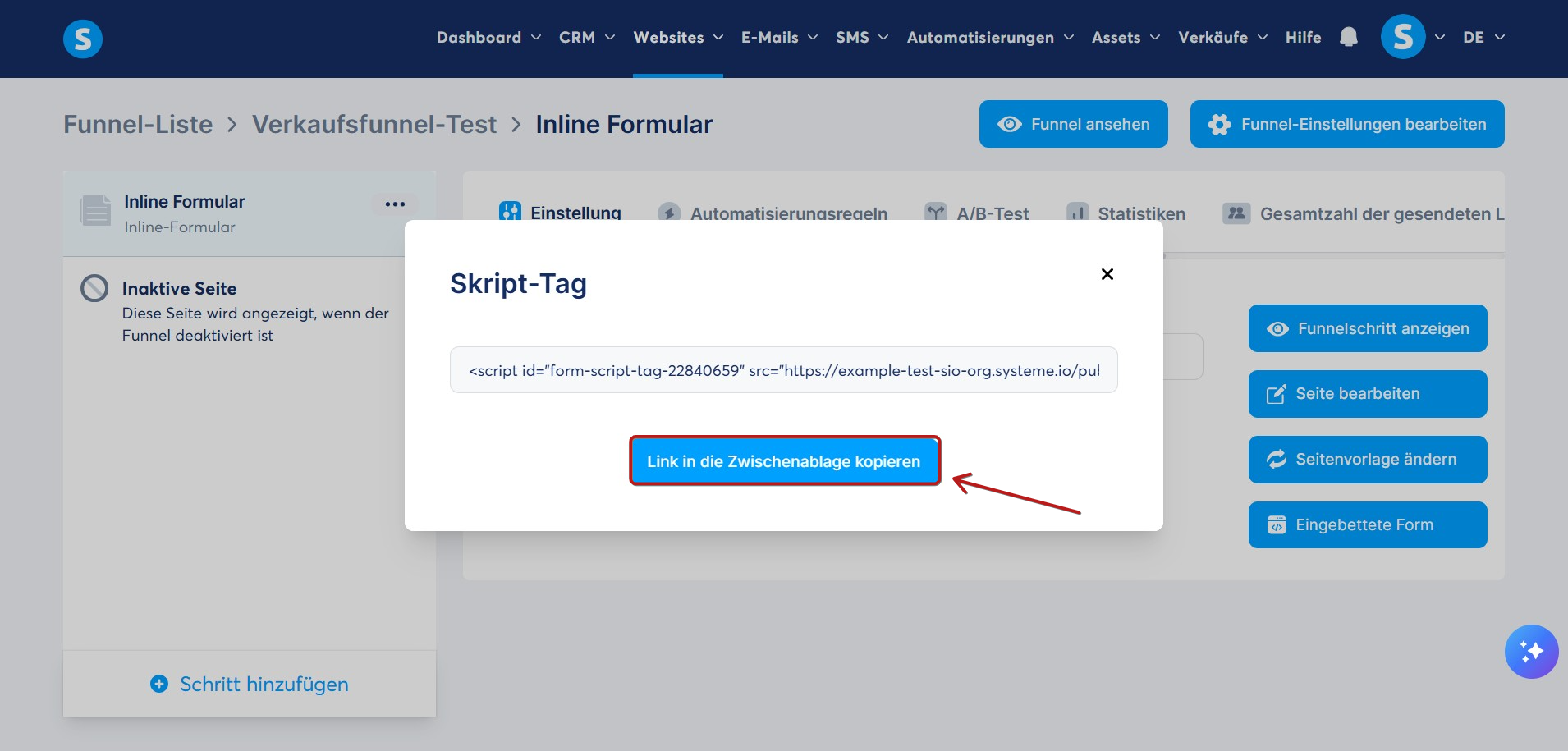 Es wird ein Popup-Fenster angezeigt, das einen Link zu Ihrer Inline-Formular-Seite enthält. Klicken Sie auf Link in die Zwischenablage kopieren.