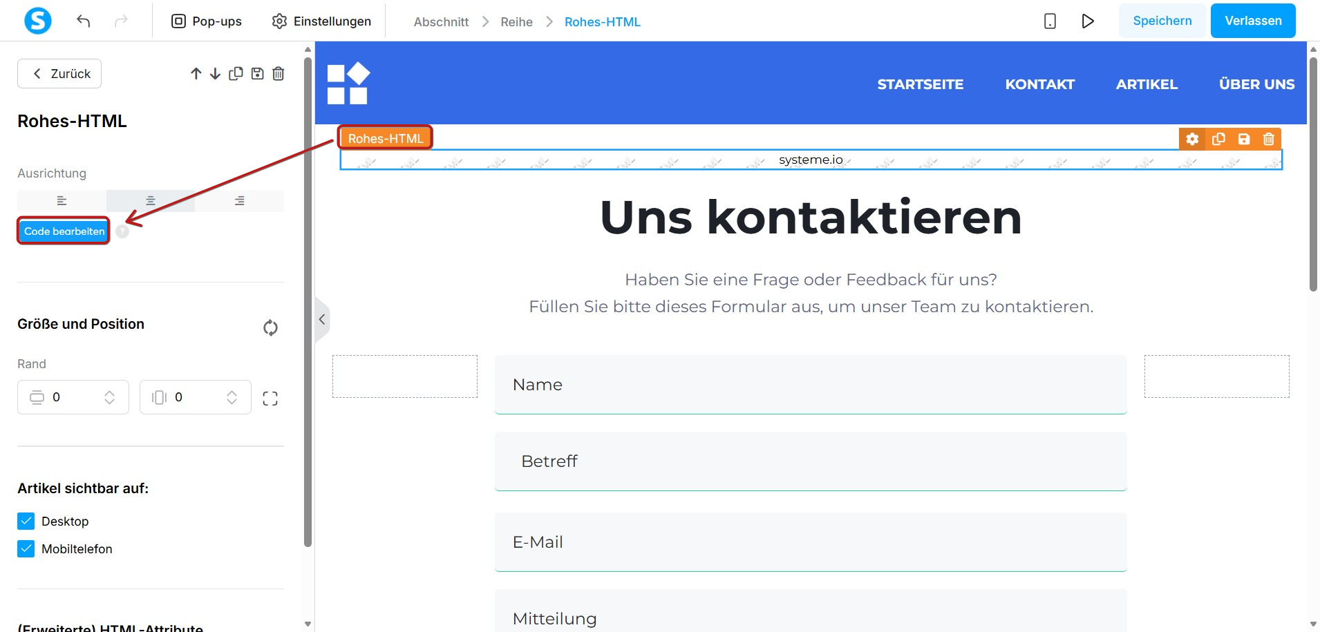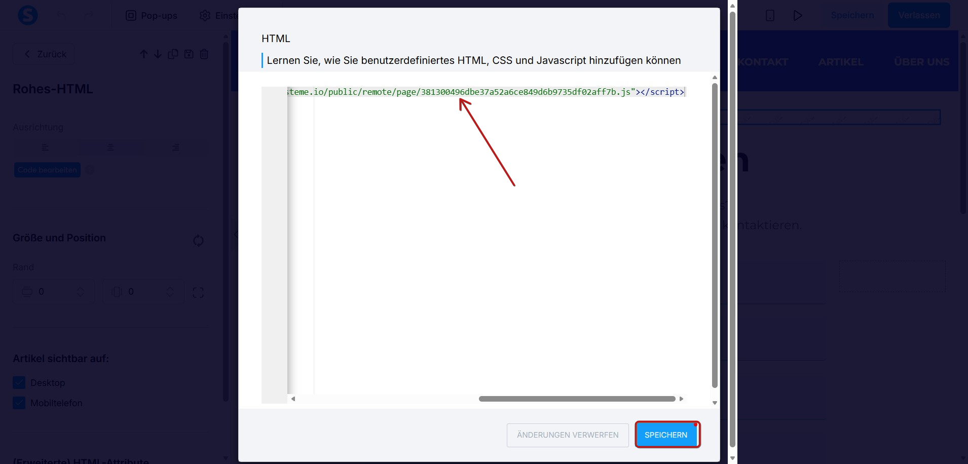 Klicken Sie auf Code bearbeiten und fügen Sie das Skript des Links ein, der die Popup-Formular-Seite öffnet, und klicken Sie anschließend auf Speichern.