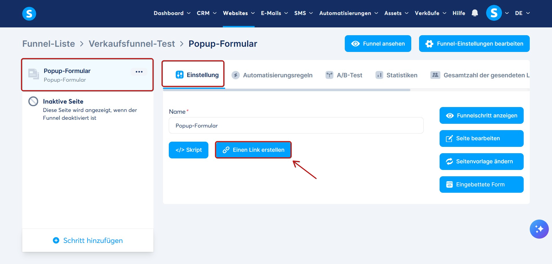 Um das Popup-Formular nach einem Klick auf einen Text anzuzeigen, müssen Sie zunächst zur Einstellung Ihres Popup-Formulars zurückkehren und anschließend auf Einen Link erstellen klicken.