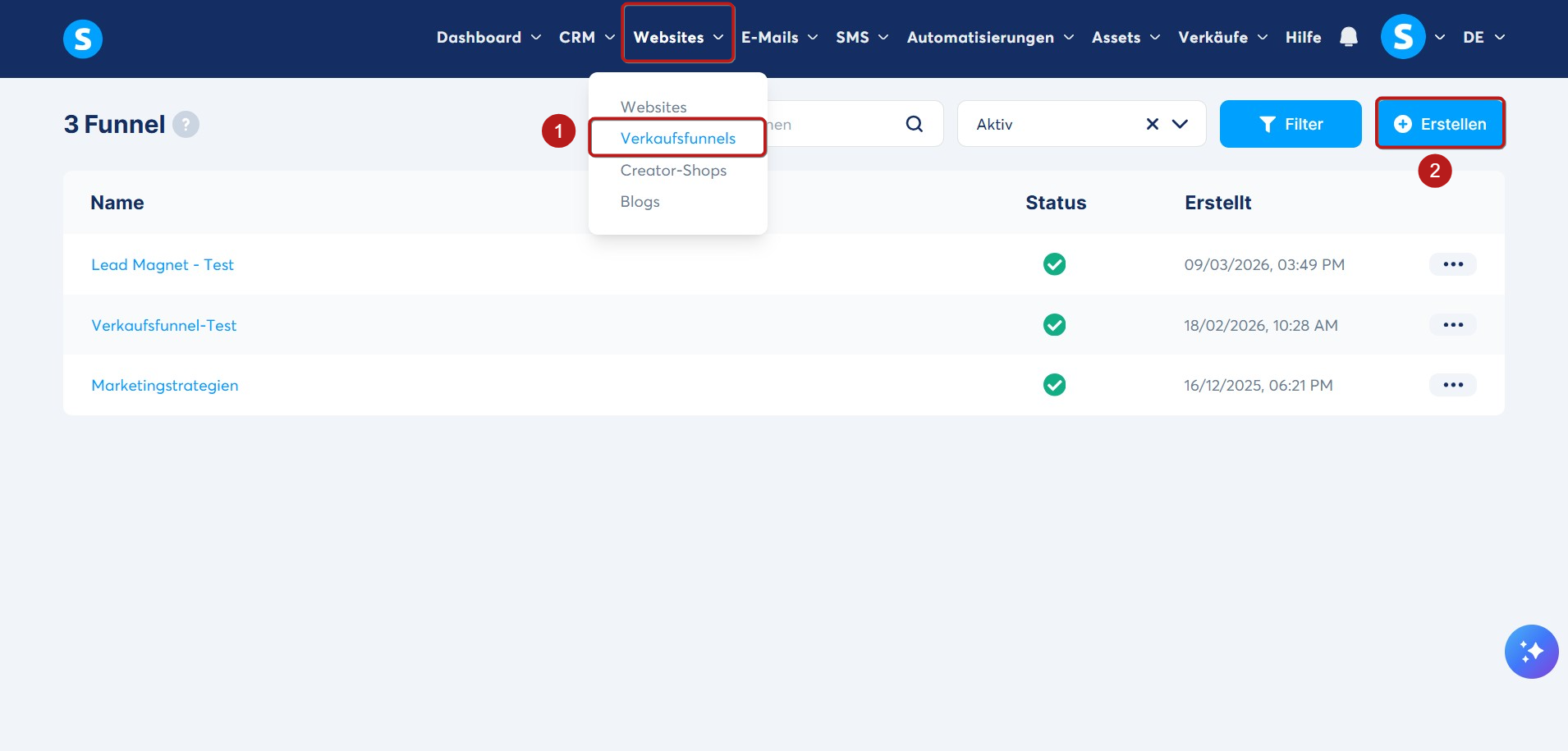 Klicken Sie auf den Reiter Websites, dann auf Verkaufsfunnels (1) und schließlich auf Erstellen (2).