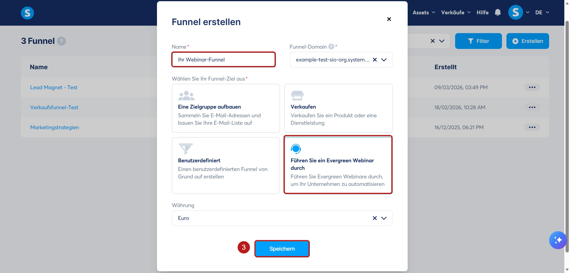 Geben Sie Ihrem Funnel einen Namen, wählen Sie Evergreen-Webinar durchführen als Ziel aus und klicken Sie auf Speichern (3).