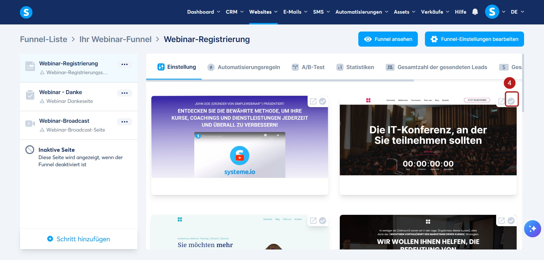 Ihr Funnel wird standardmäßig mit 3 Seiten erstellt, die in der linken Spalte aufgelistet sind. Wählen Sie eine Vorlage für Ihre Registrierungsseite aus, indem Sie durch die verfügbaren Templates browsen und eines auswählen (4).