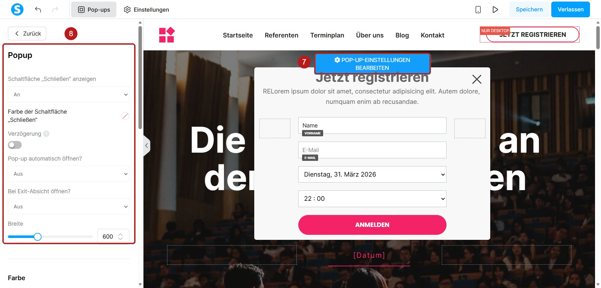 Klicken Sie auf Popup-Einstellungen bearbeiten (7), um das Registrierungsformular zu konfigurieren. Die Einstellungen werden in der linken Seitenleiste angezeigt (8).