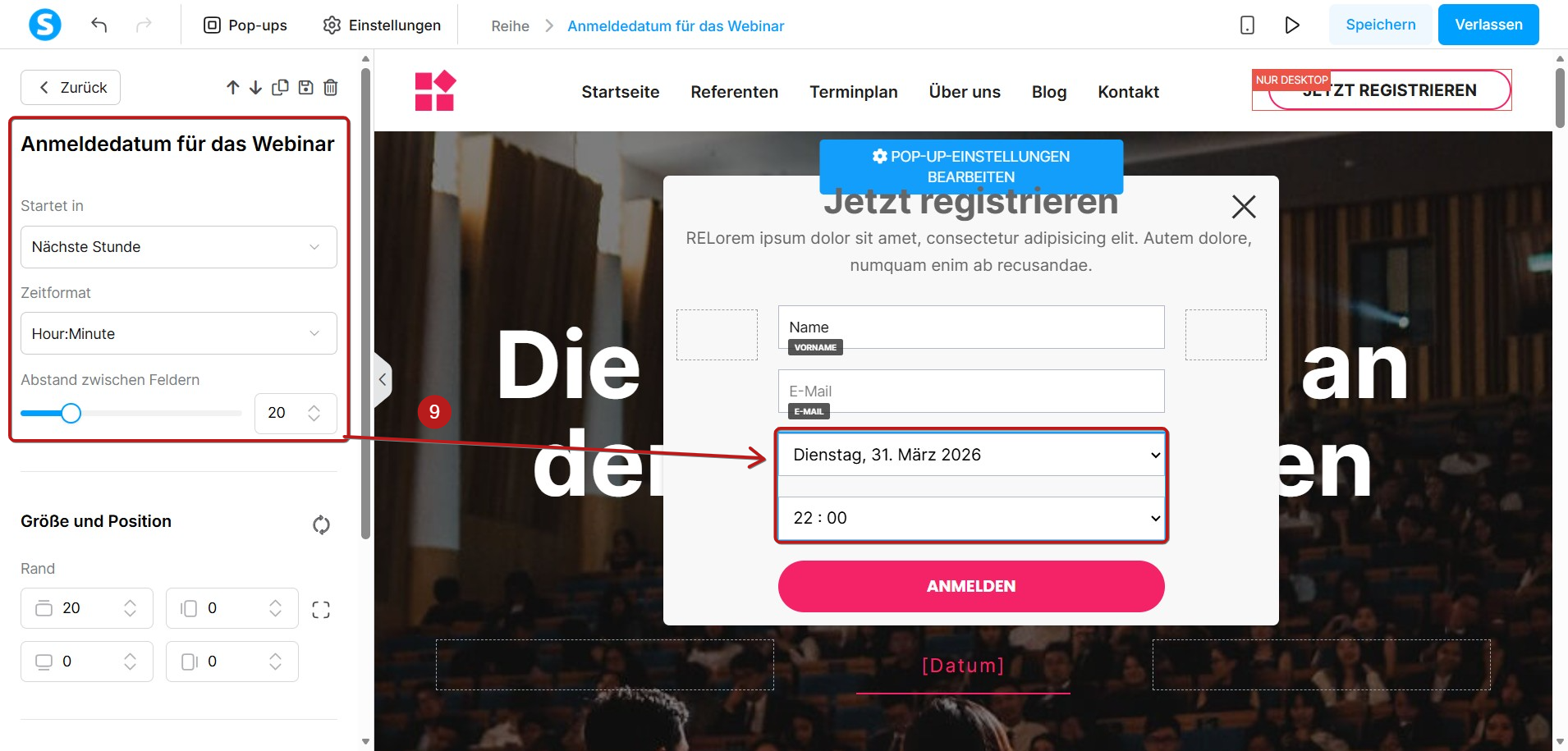 Um dieses zu konfigurieren, klicken Sie auf das Webinar-Datum-Element in Ihrem Formular und passen Sie die Optionen nach Bedarf an (9).