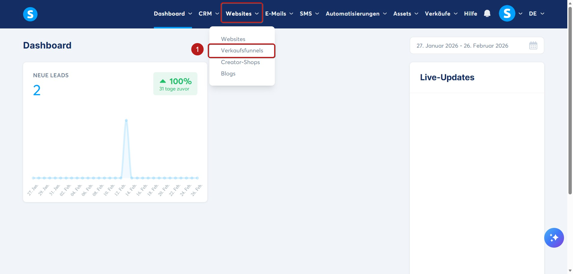 Gehen Sie zunächst zu Sales funnels (1) unter Websites, um auf Ihre Funnels zuzugreifen.