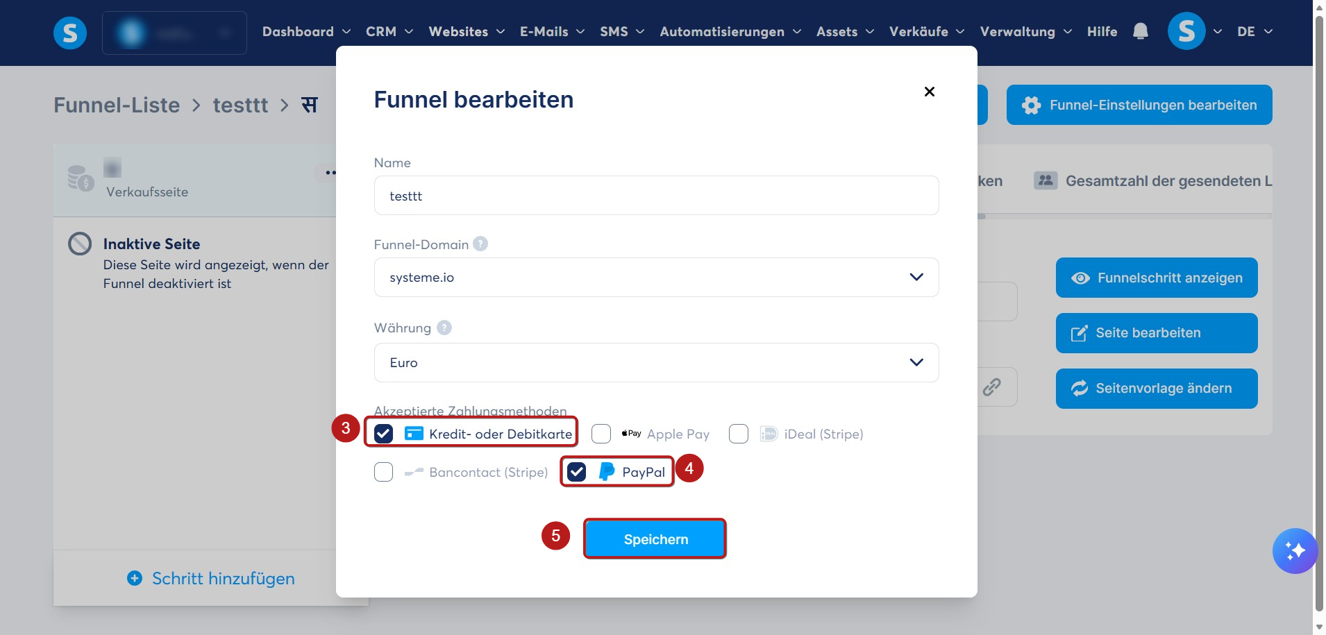 Aktivieren Sie das Kontrollkästchen PayPal (4).