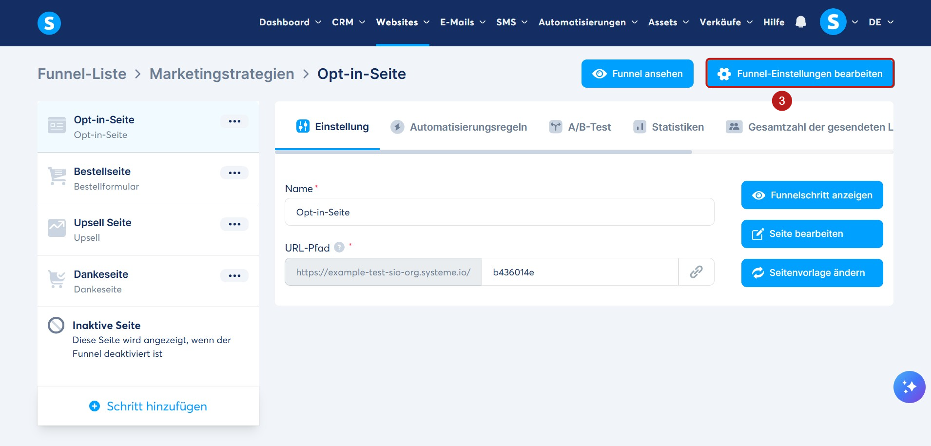 Klicken Sie anschließend auf Funnel-Einstellungen bearbeiten (3).