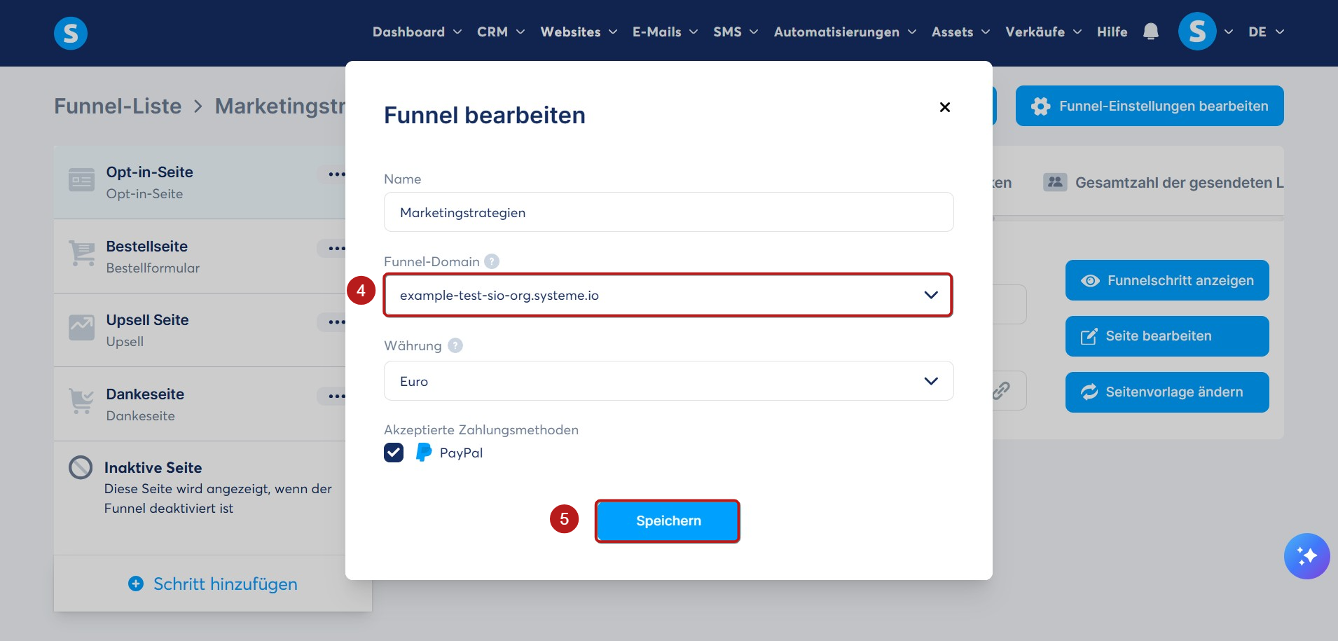 Klicken Sie auf Speichern (5), um die neue Domain auf alle Seiten des Funnels anzuwenden.