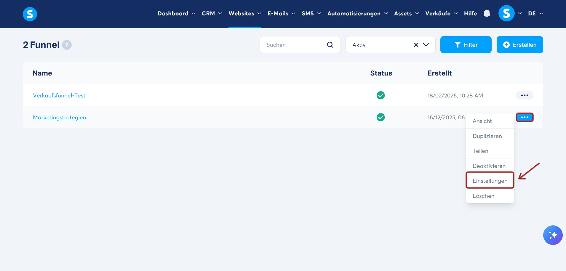 Sie können diese Einstellungen auch aufrufen, indem Sie auf die drei Punkte neben dem Funnel klicken und Einstellungen auswählen.