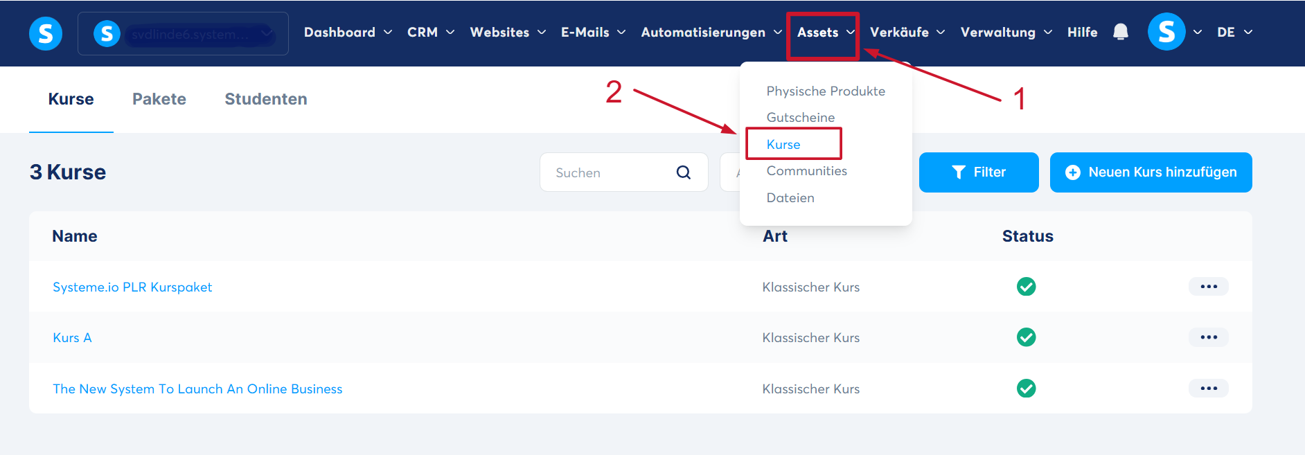 Gehen Sie im Menü auf „Assets“ (1) und dann auf „Kurse“ (2).