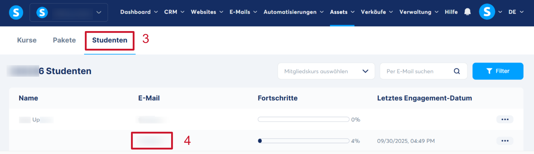 Gehen Sie in den Bereich „Studenten“ (3), um die Liste der Studenten anzuzeigen, die Zugriff auf Ihre Kurse haben. Navigieren Sie zur Datei des Studenten und klicken Sie auf dessen E-Mail-Adresse, um den Sitzungsprotokollbericht zu exportieren (4).