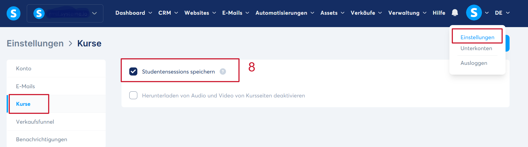 Hinweis: Damit die Aktivitäten der Studenten aufgezeichnet werden, müssen Sie in den „Kurse“-Einstellungen die Option „Studentensitzungen speichern“ aktivieren (8).