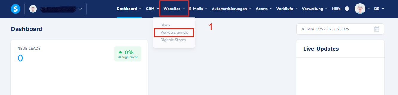 Gehen Sie auf die Schaltfläche "Websites", darunter finden Sie "Verkaufsfunnels" (Nummer 1 im Bild).