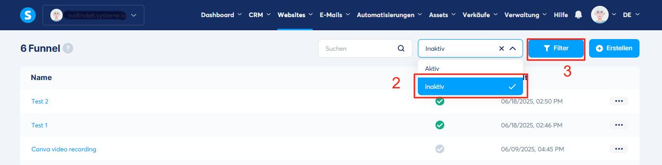 Klicken Sie auf das Dropdown-Menü (Nummer 2 im Bild) und wählen Sie „Inaktiv“ als Suchfilter aus. Klicken Sie anschließend auf „Filter“, um eine Liste der inaktiven Funnels anzuzeigen (Nummer 3 im Bild).