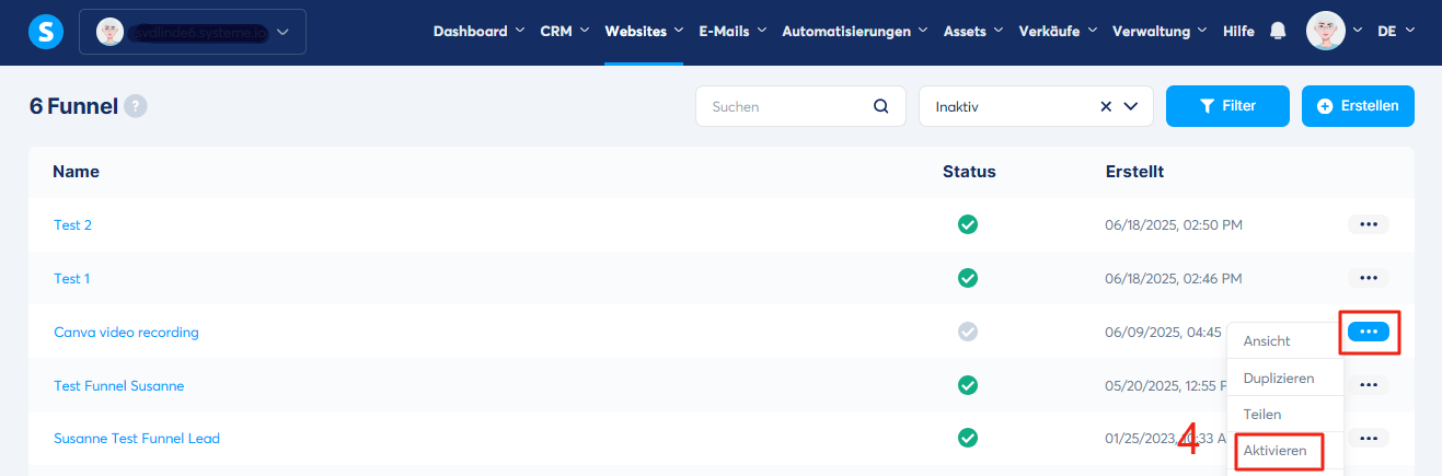 Suchen Sie den Funnel, den Sie aktivieren möchten, klicken Sie auf die 3 Punkte und dann auf "Aktivieren" (Nummer 4 im Bild).