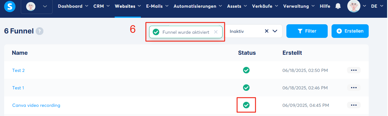 Nach der Bestätigung erscheint oben eine Meldung, die Sie darüber informiert, dass der ausgewählte Funnel erfolgreich aktiviert wurde (Nummer 6 im Bild).