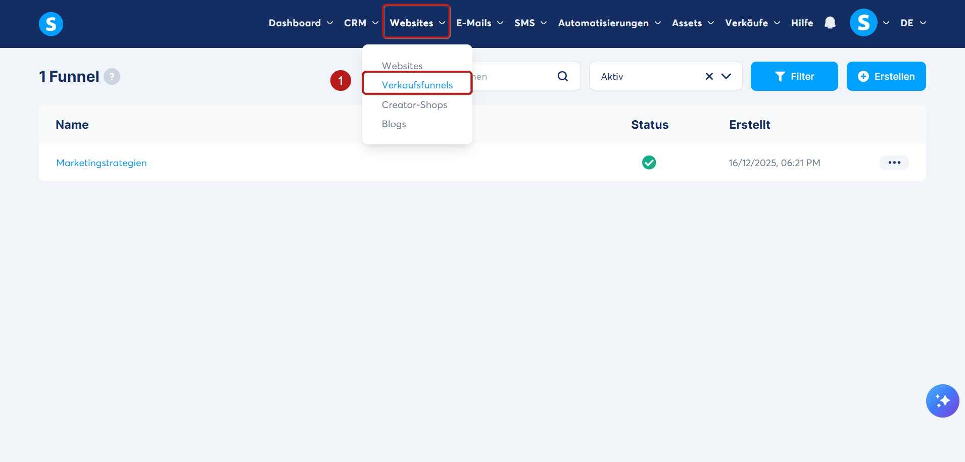 Navigieren Sie im Menü zum Tab Websites und klicken Sie anschließend auf Verkaufsfunnels (1), um Ihre Liste der Verkaufsfunnels anzuzeigen.