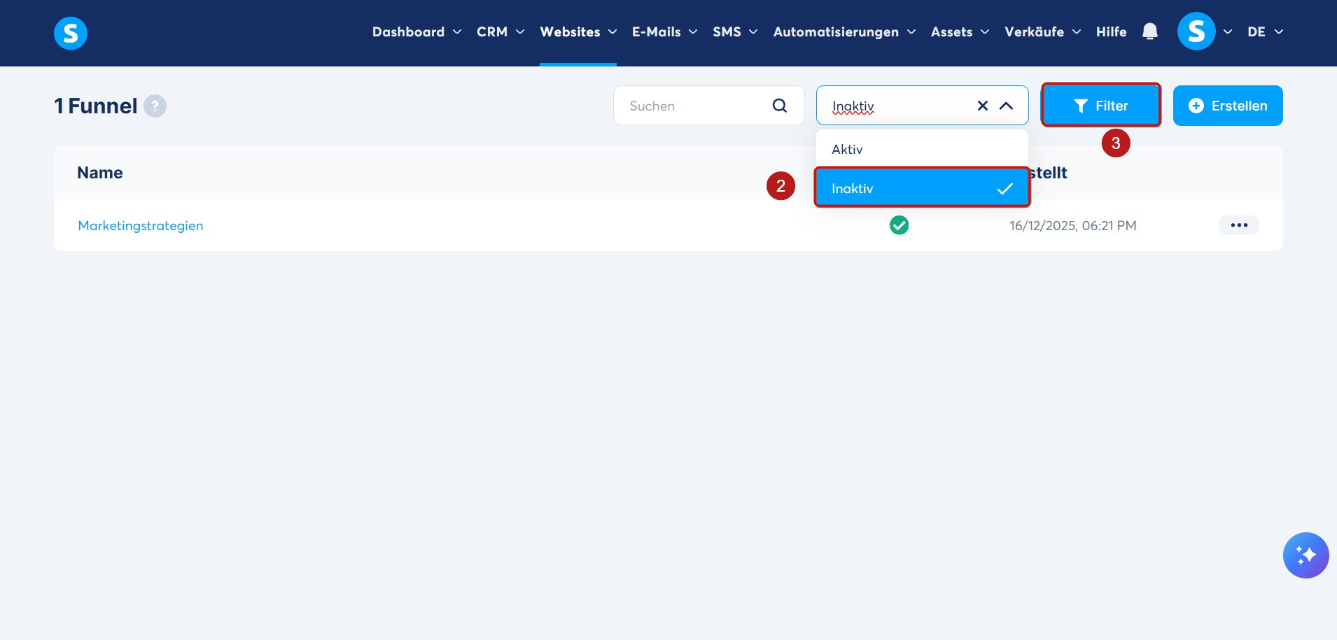 Klicken Sie auf das Dropdown-Menü und wählen Sie Inaktiv (2) als Suchfilter aus. Klicken Sie anschließend auf Filter (3), um Ihre Liste der inaktiven Funnels anzuzeigen.