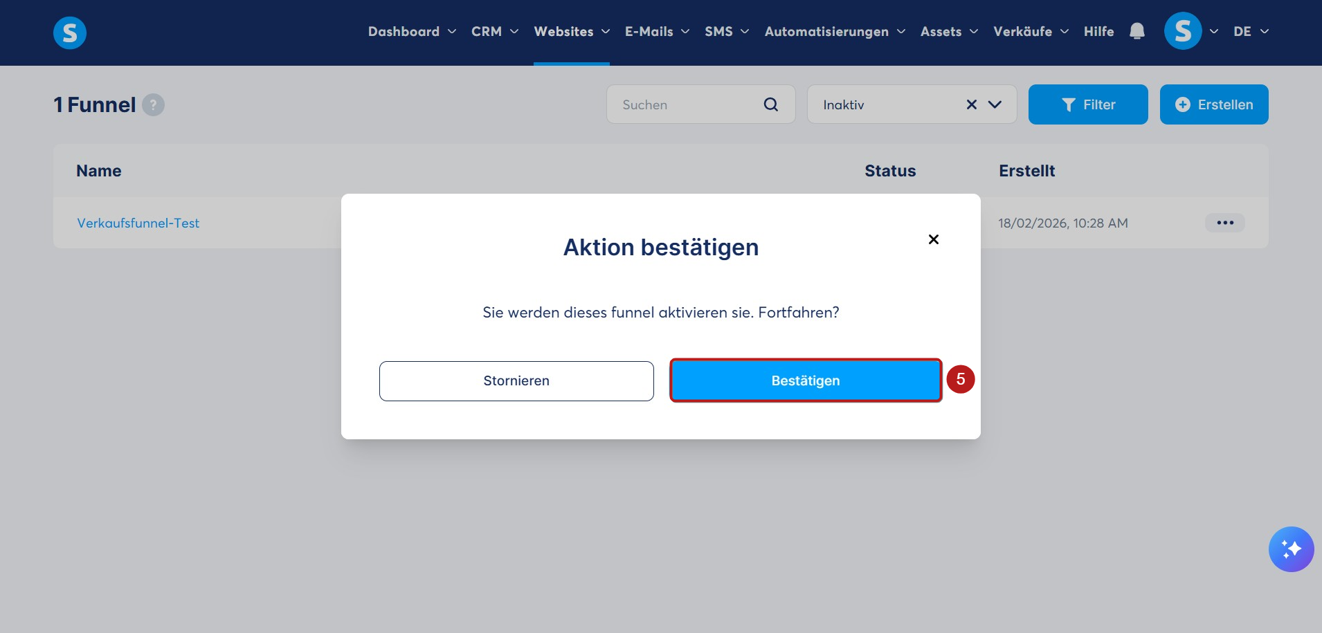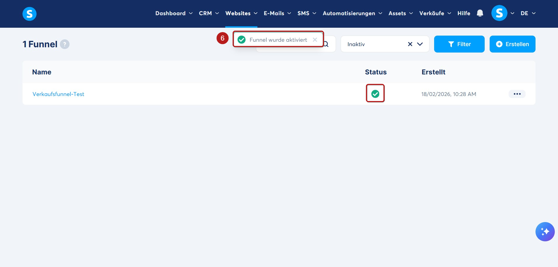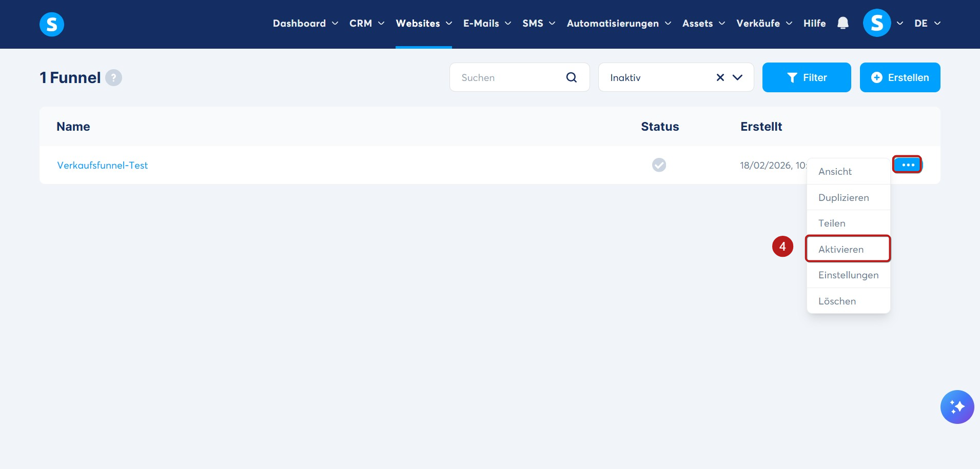 Suchen Sie den Funnel, den Sie aktivieren möchten, klicken Sie auf die drei Punkte (...), und wählen Sie anschließend Aktivieren (4) aus.