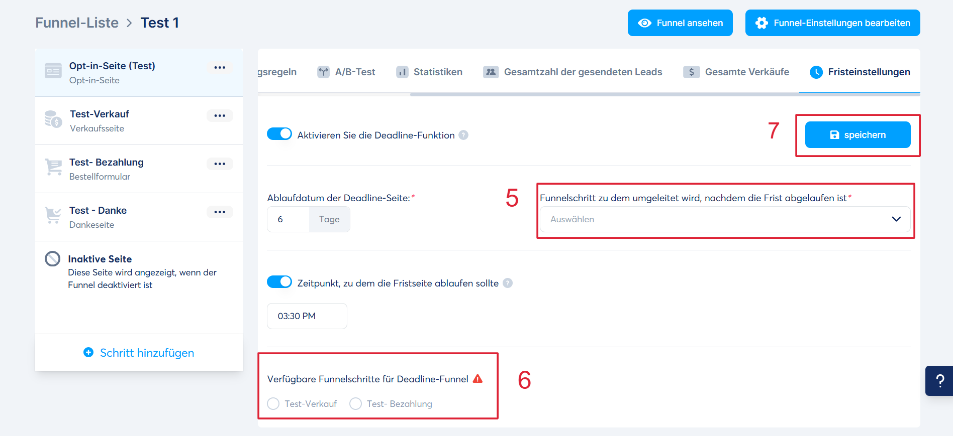 - Wählen Sie im Feld „Funnelschritt zu dem umgeleitet wird, nachdem die Frist abgelaufen ist“ die Seite aus, zu der Ihre Leads nach Ablauf der Frist weitergeleitet werden sollen (5).