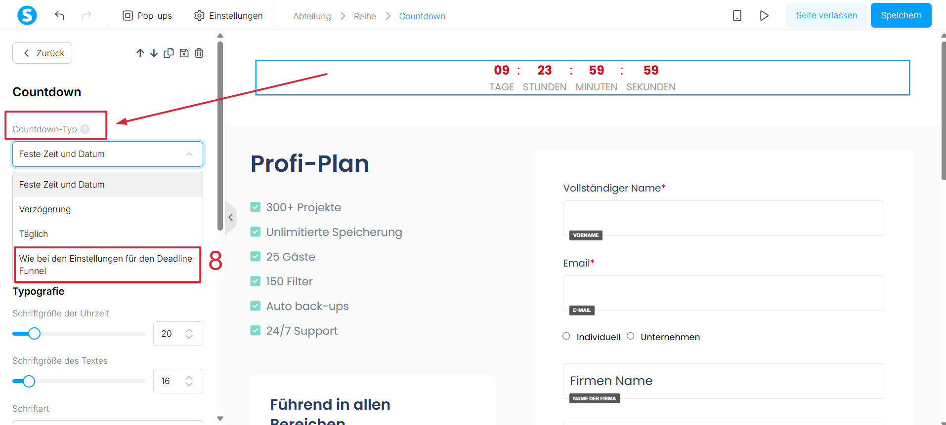 Wenn Sie einen Countdown-Timer in Ihrem Funnel verwenden, wählen Sie im Seiten-Editor einfach die Option Wie bei den Einstellungen für den Deadline-Funnel (8) aus. Die beiden Funktionen werden automatisch synchronisiert.