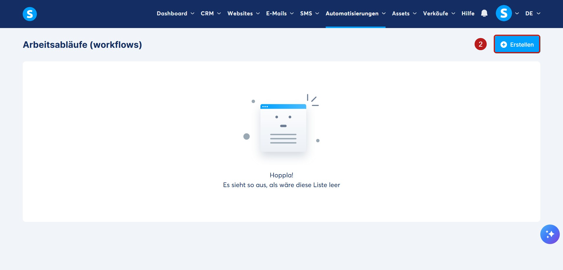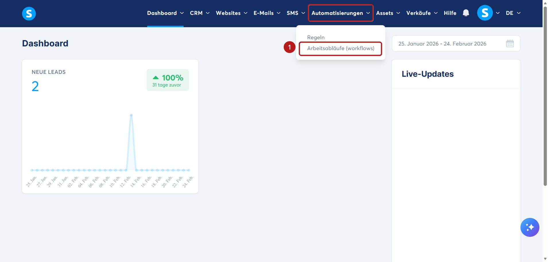 Melden Sie sich in Ihrem systeme.io-Konto an, klicken Sie in der Menüleiste auf den Reiter Automatisierungen und wählen Sie dann Workflows (1) aus.