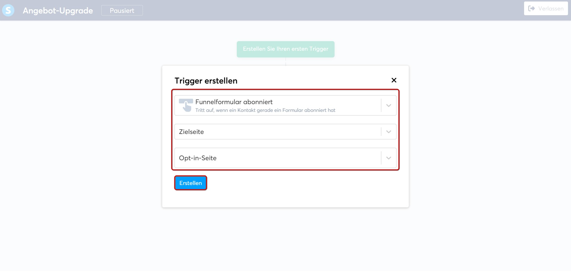 1.) Erstellen Sie einen Trigger: Wählen Sie Funnelformular abonniert und wählen Sie die Opt-in-Seite aus. Klicken Sie auf Erstellen.