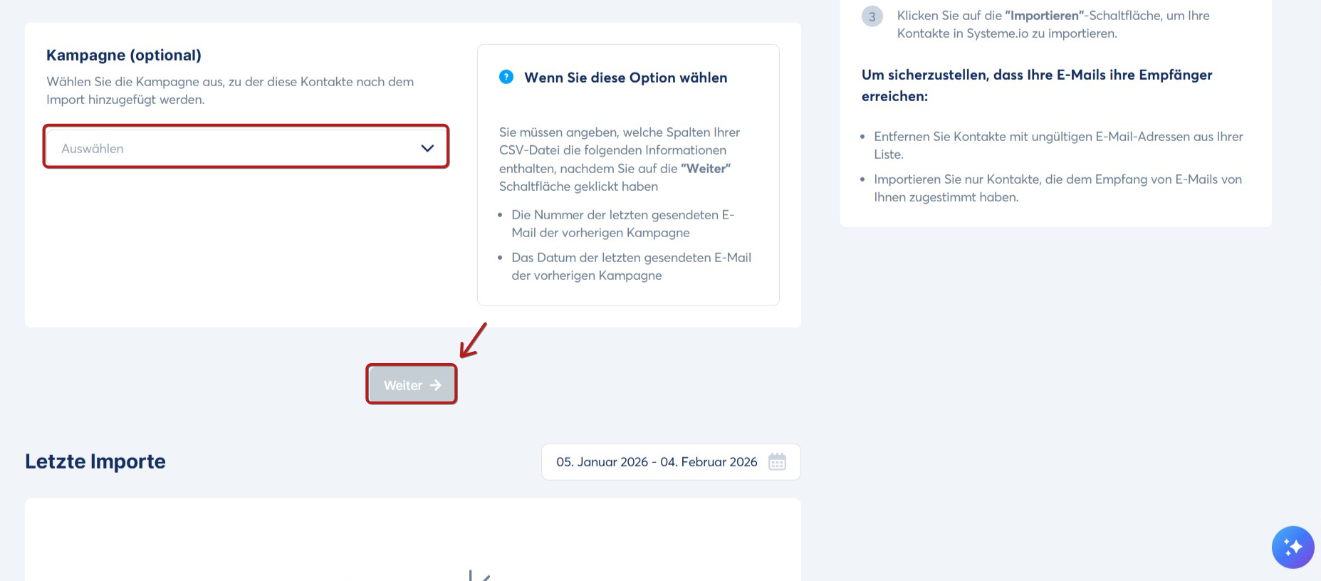 Wenn Sie Ihre Kontaktliste in systeme.io importieren, klicken Sie auf das Dropdown-Menü Kampagne (optional) und wählen Sie die gewünschte Kampagne aus. Klicken Sie anschließend auf Weiter.