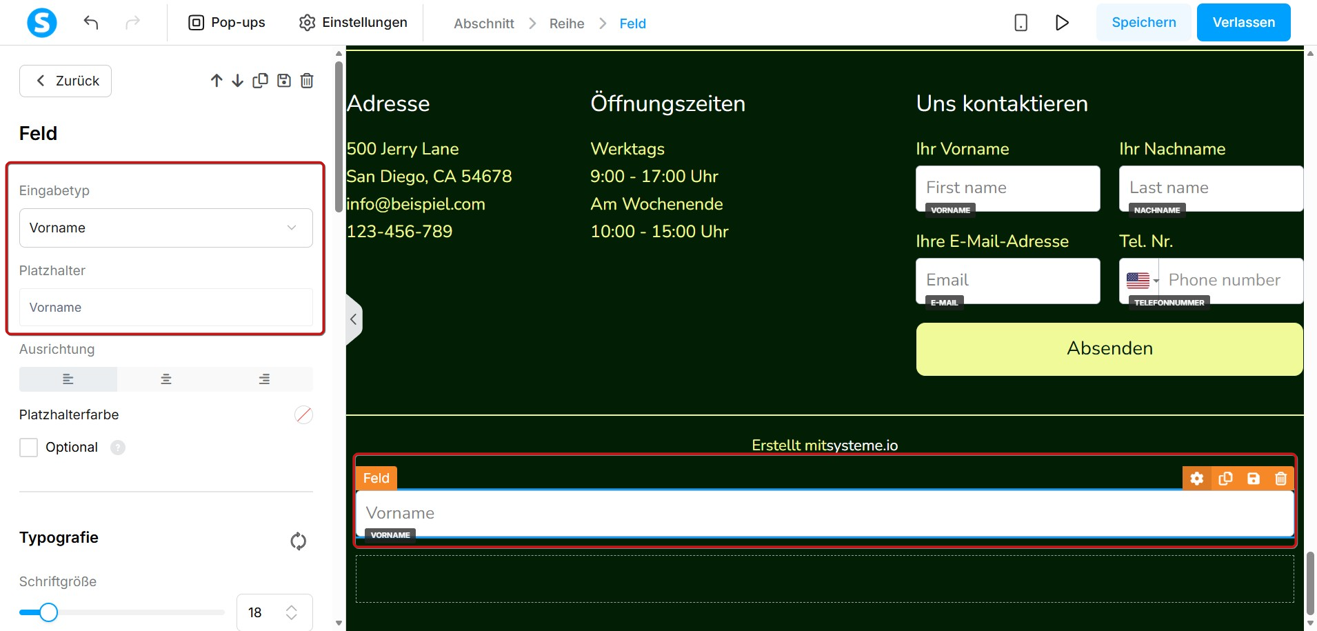 Klicken Sie auf das Feld, um dessen Einstellungen links anzuzeigen, und wählen Sie dann die Art der Informationen aus, die Sie sammeln möchten, indem Sie den Eingabetyp festlegen.