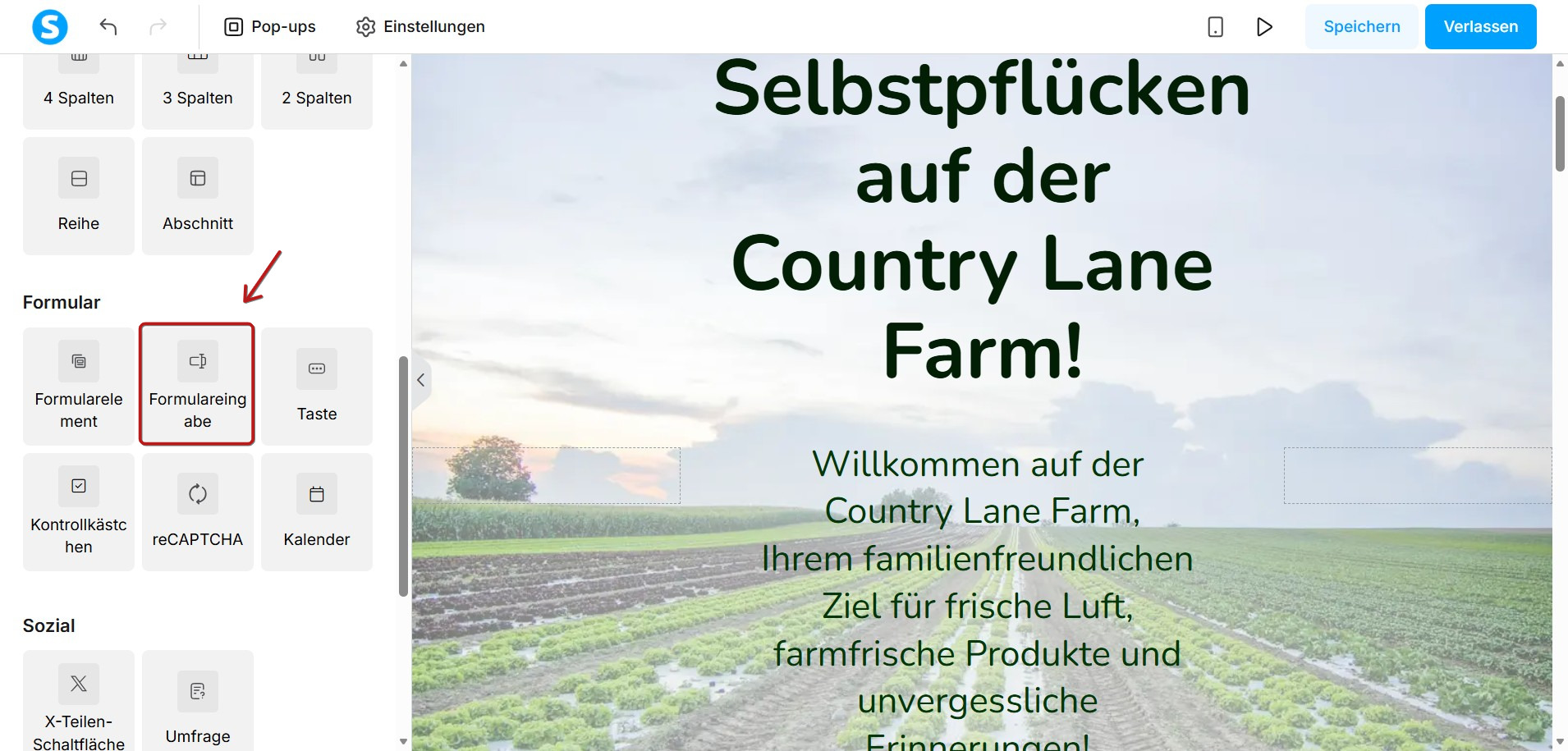 Wählen Sie das Formulareingabe-Element unter den verfügbaren Elementen im Abschnitt Formular des Editors aus und ziehen Sie es auf Ihre Seite: