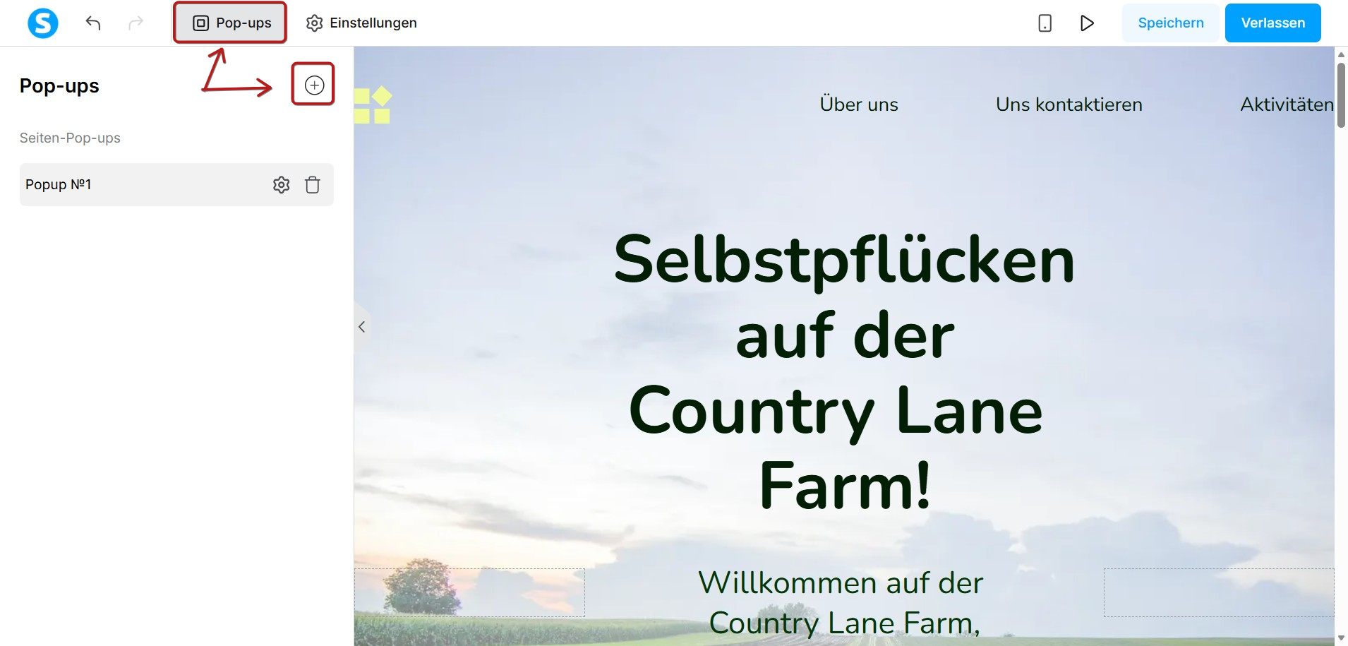 Um ein Pop-up zu Ihrer Opt-in-Seite hinzuzufügen, öffnen Sie den Editor und klicken Sie auf Pop-ups und anschließend auf das Plus-Symbol (+):