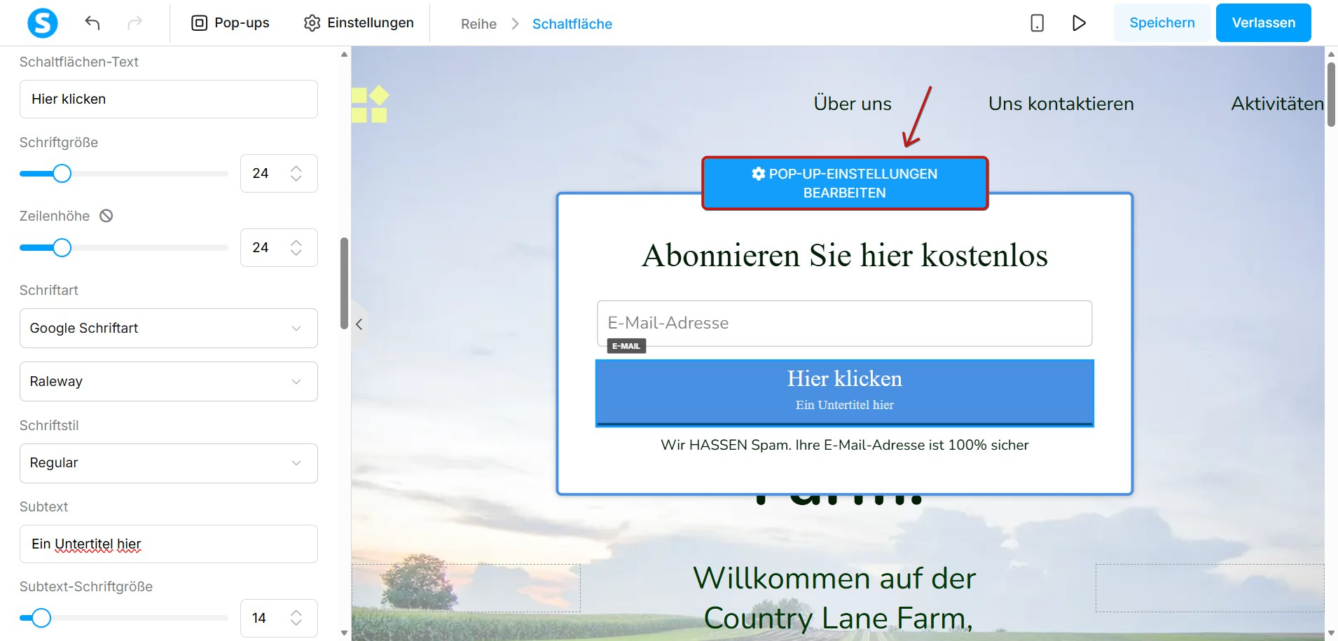Das Pop-up wird dann zu Ihrer Seite hinzugefügt. Klicken Sie auf die Schaltfläche Pop-up-Einstellungen bearbeiten, um es zu bearbeiten: