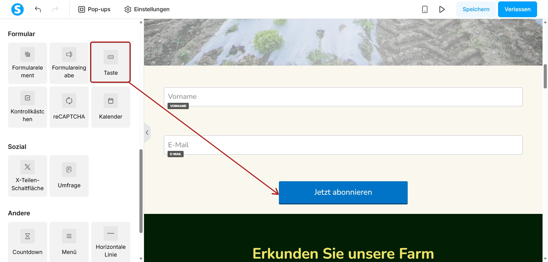 Um sicherzustellen, dass die E-Mail-Adressen Ihrer Kontakte zu Ihrer Kontaktliste hinzugefügt werden, ziehen Sie ein Button-Element per Drag-and-Drop in Ihr Formular (entweder auf die Seite oder in ein Popup):