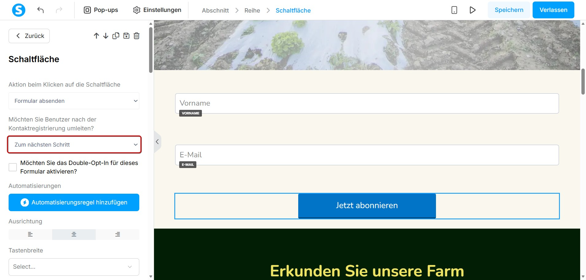 Die Option Aktion beim Klicken der Schaltfläche sollte immer auf Formular absenden gesetzt sein, um Leads erfolgreich in der Kontaktliste Ihres Kontos zu erfassen.