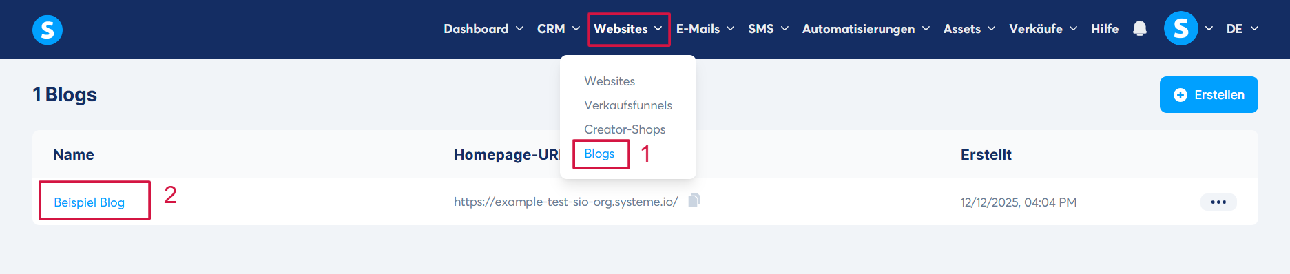 Klicken Sie auf den Tab Websites, dann auf Blogs (1) und öffnen Sie anschließend Ihren Blog, indem Sie auf dessen Titel klicken (2).