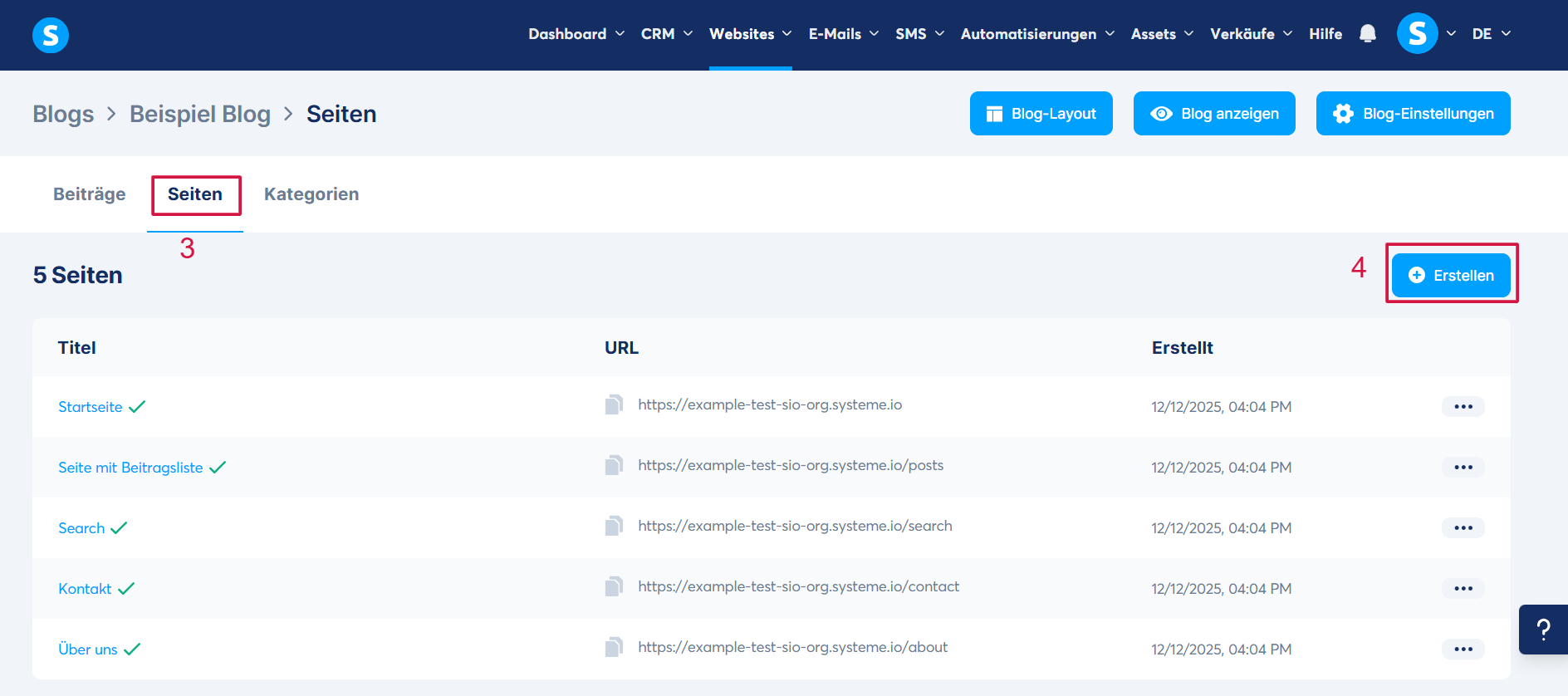 Klicken Sie anschließend auf den Tab Seiten (3) und danach auf Erstellen (4).