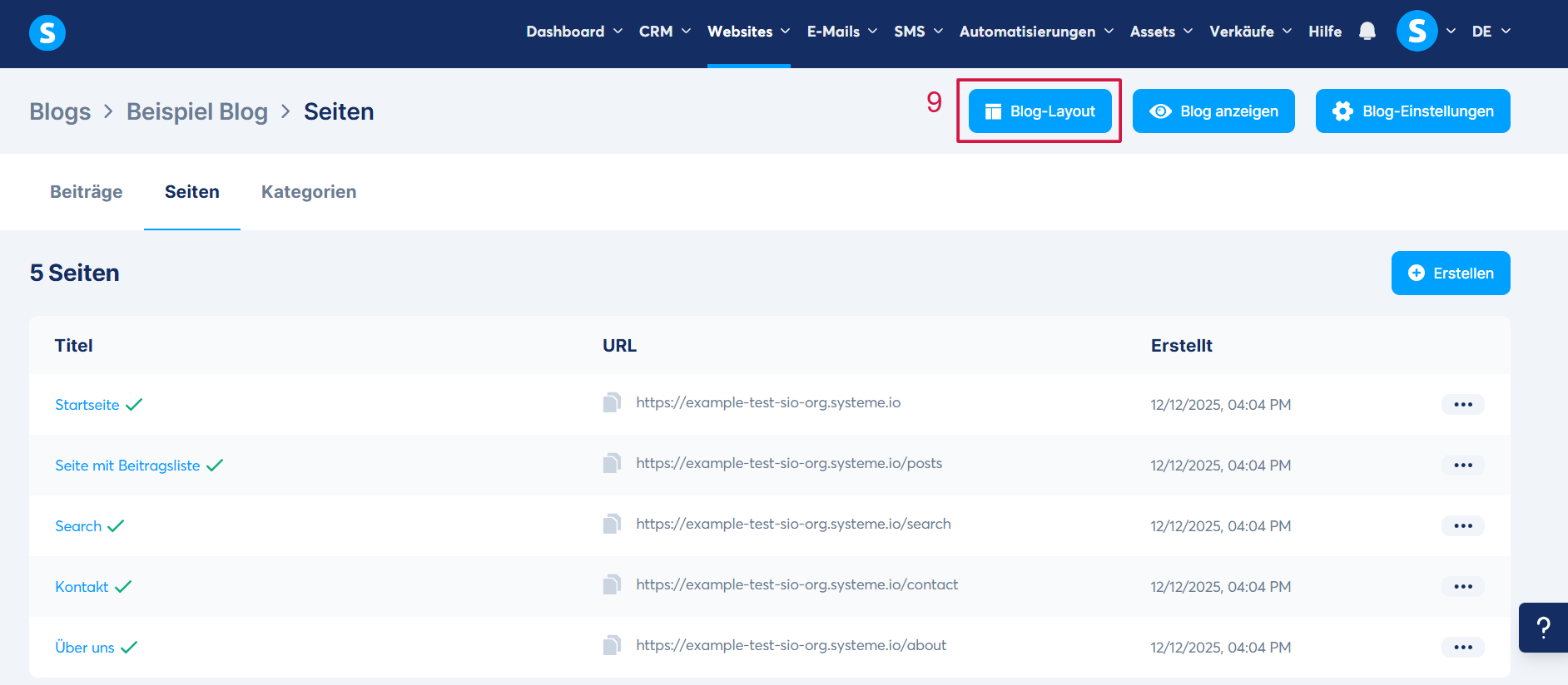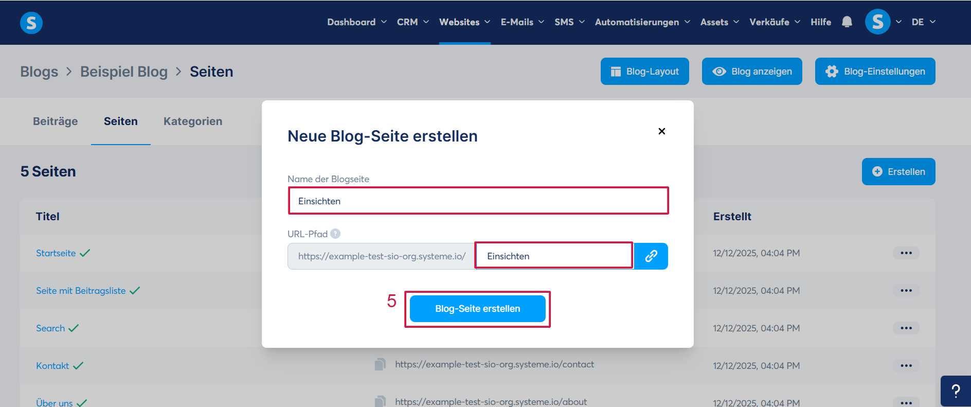 Geben Sie im angezeigten Pop-up-Fenster den Namen der Blogseite sowie deren URL-Pfad ein und klicken Sie anschließend auf „Neue Blog-Seite erstellen“ (5), um die Erstellung der neuen Blogseite zu bestätigen.