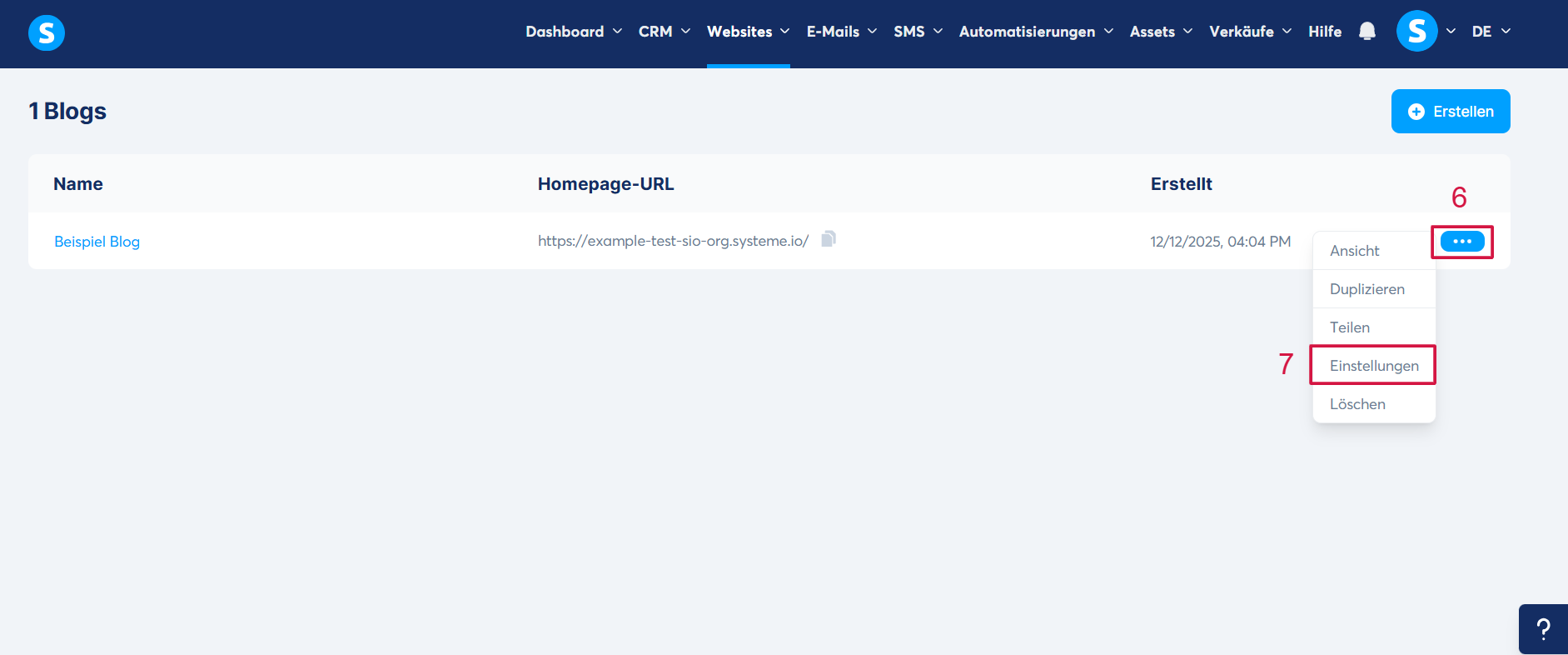 Klicken Sie auf die drei Punkte (6) Ihres ausgewählten Blogs und dann auf Einstellungen (7).