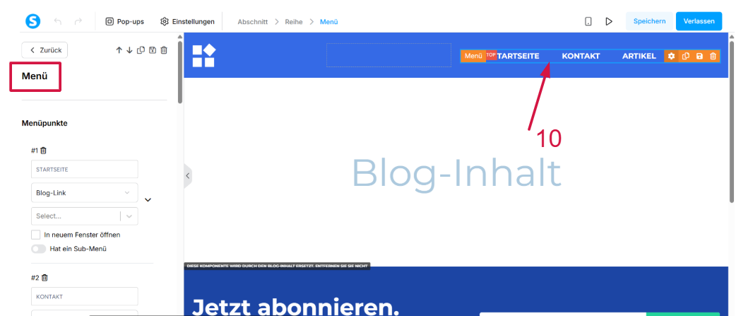 - Titel (11): Geben Sie den Namen Ihres Menüeintrags ein (z. B. Startseite).