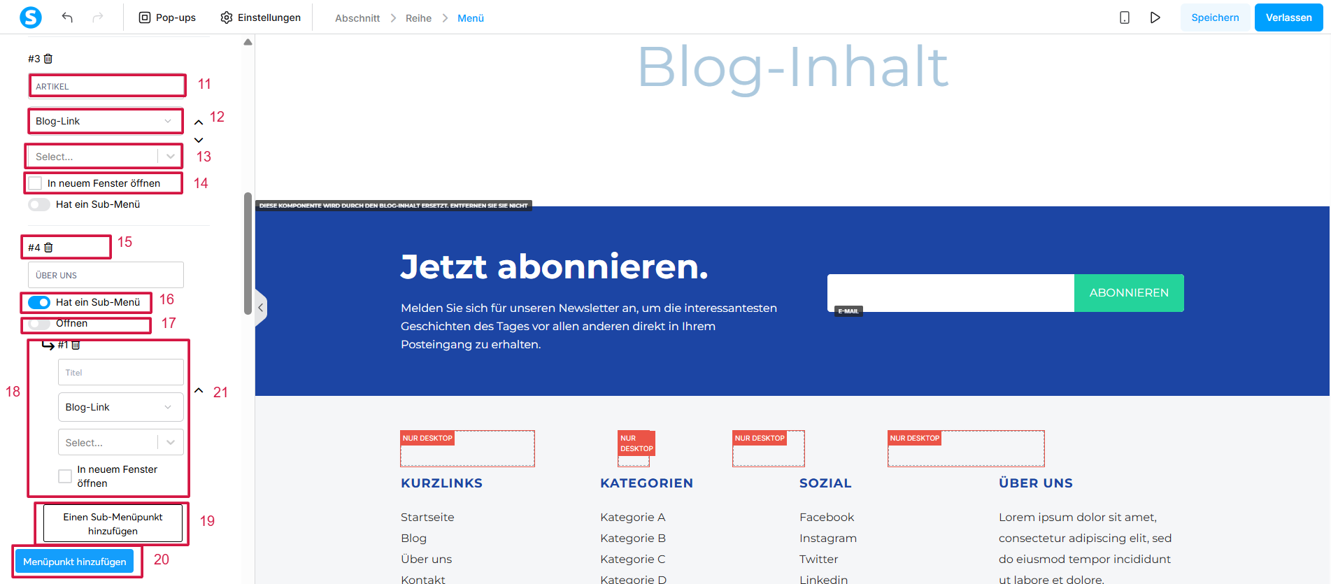 - Untermenü-Einstellungen (18): Untermenüeinträge verwenden die gleichen Optionen wie Hauptmenüeinträge.