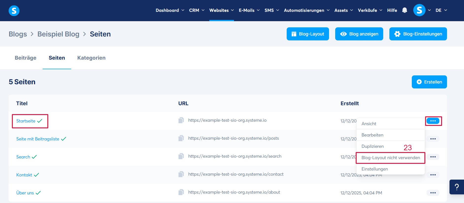 Um das Menü von einer Ihrer Seiten zu entfernen, klicken Sie auf Blog-Layout nicht verwenden (23).