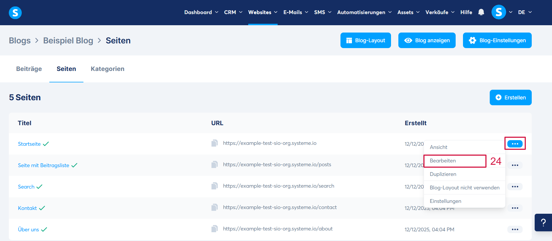 Öffnen Sie dazu den Editor der Seite, die Sie gestalten möchten, indem Sie auf Bearbeiten (24) klicken oder direkt auf den Namen der Seite.