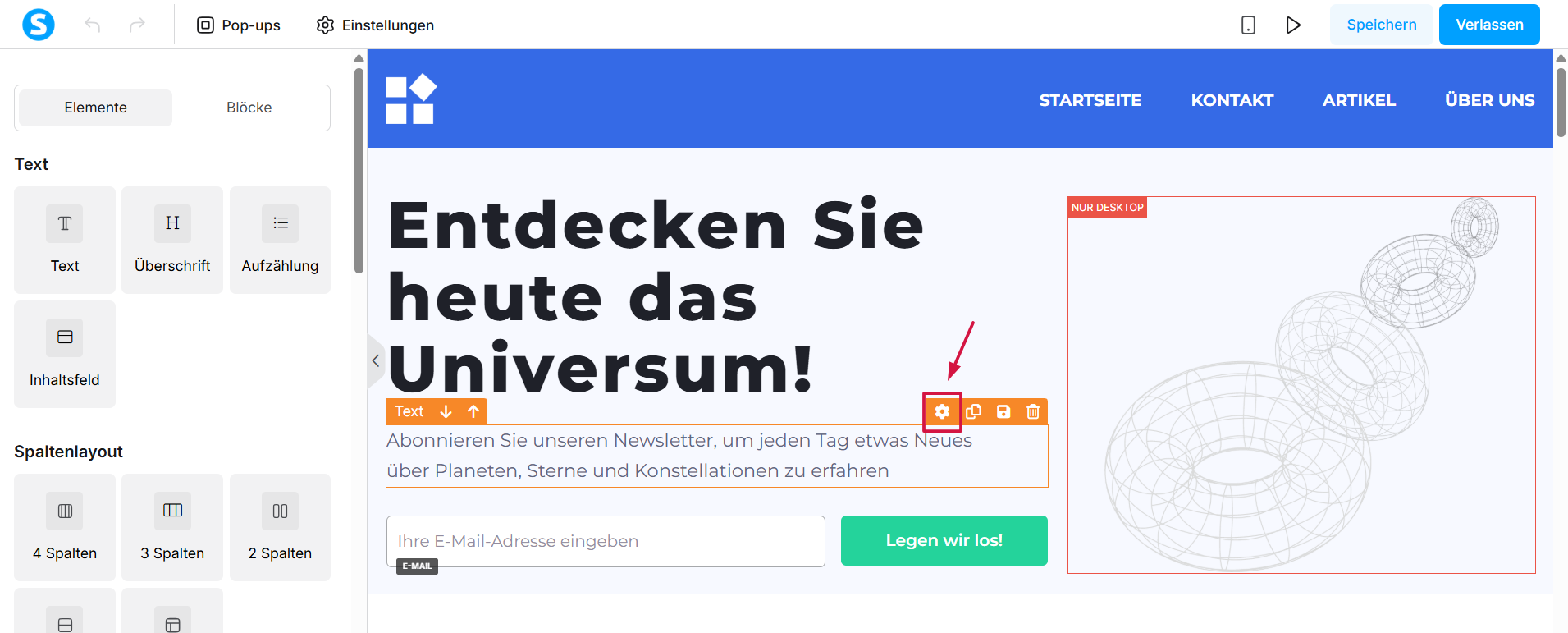 Hinweis: Wir empfehlen, in unserer Wissensdatenbank zu suchen, in der Sie Hilfeseiten finden, die erklären, wie Sie die verschiedenen Elemente im Seiten-Editor verwenden.