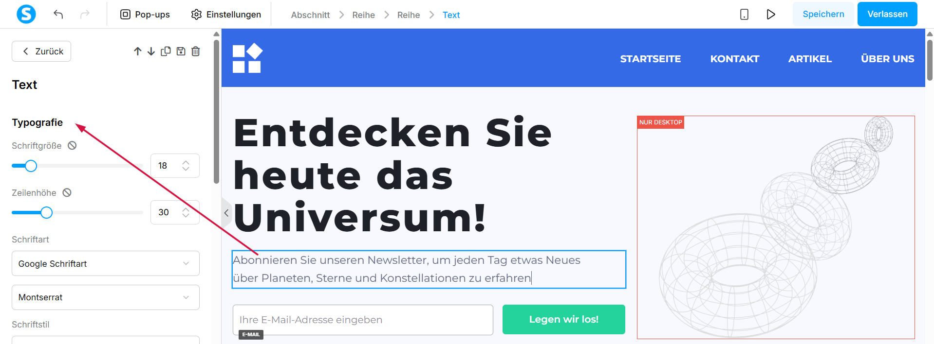 Sobald Sie das Element ausgewählt haben, das Sie bearbeiten möchten, verwenden Sie den Editor auf der linken Seite, um Ihre Änderungen vorzunehmen. Sie können Typografie, Farbe, Größe und Position anpassen.