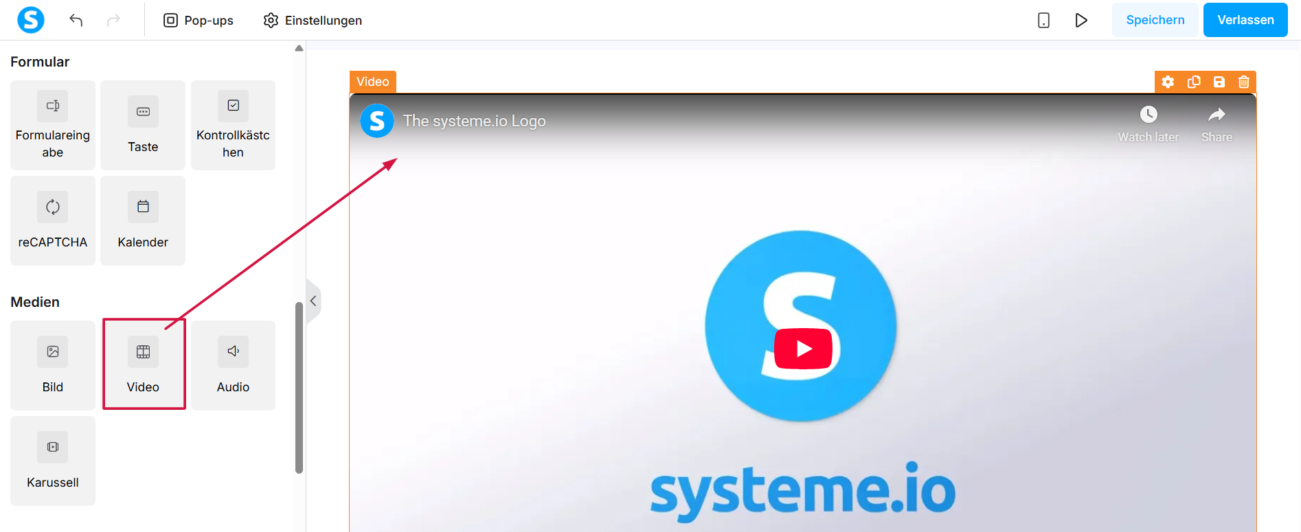 Klicken Sie auf das gewünschte Element, ziehen Sie es auf Ihre Seite und platzieren Sie es an der passenden Stelle.