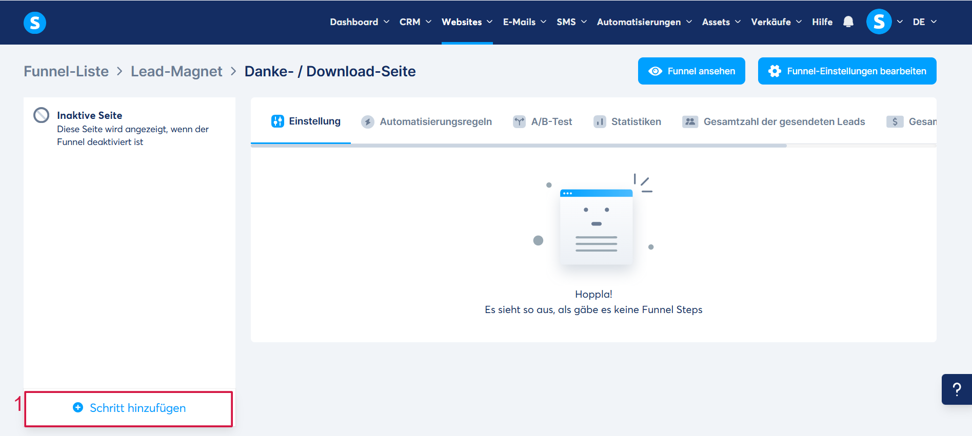 Öffnen Sie Ihren Funnel und klicken Sie dann auf Schritt hinzufügen (1).