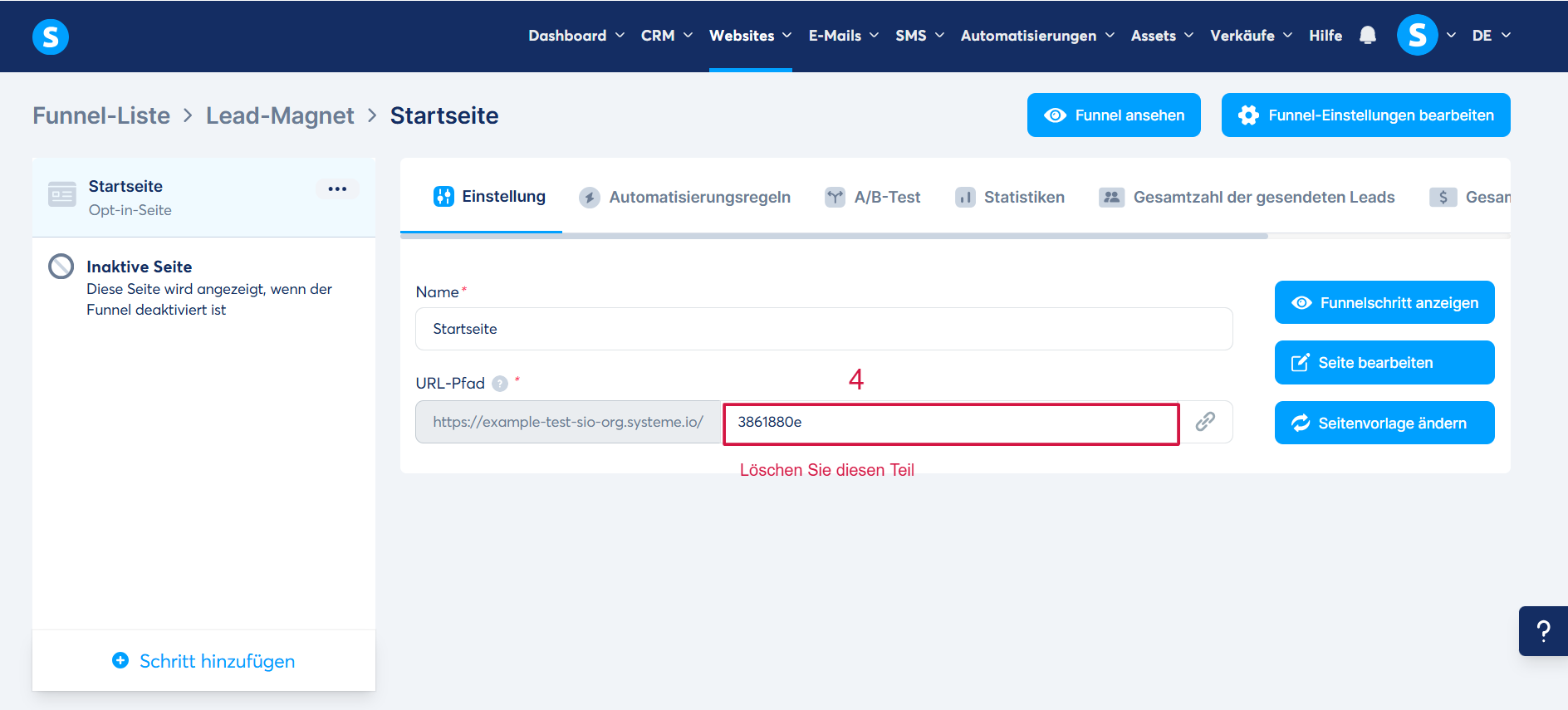 Öffnen Sie Ihren Funnel, klicken Sie auf die Seite, die Sie als Startseite festlegen möchten, und löschen Sie den URL-Pfad (4).