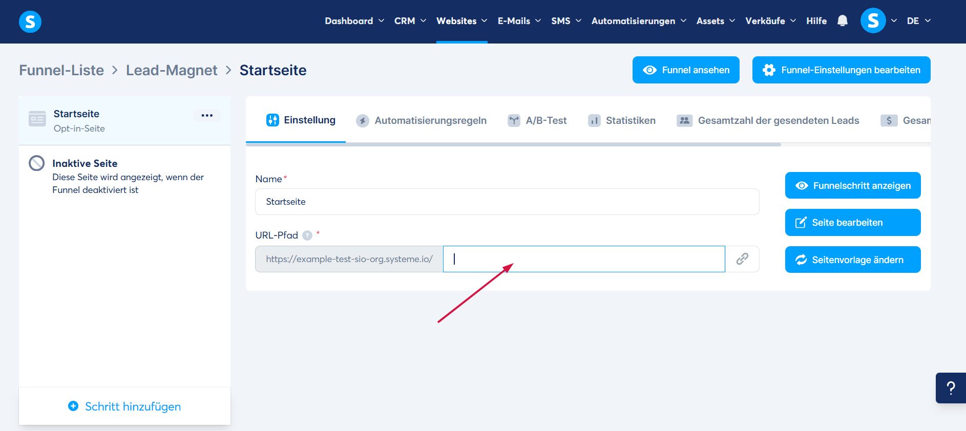 - einen benutzerdefinierter Domainname, der zuvor mit systeme.io verbunden wurde (Integration Ihrer Root-Domain in systeme.io)