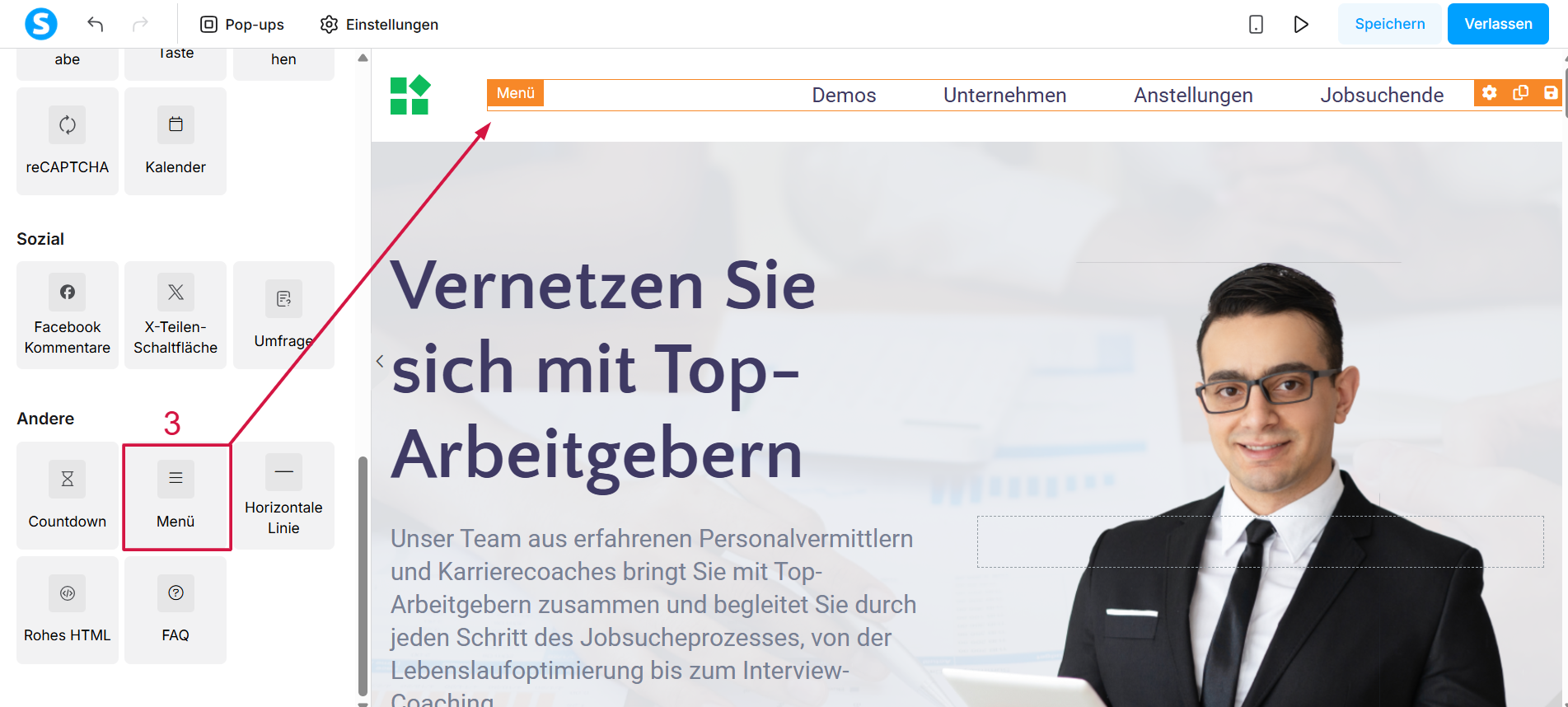 Öffnen Sie den Editor Ihrer Startseite, ziehen Sie das Menü-Element (3) auf die Seite und platzieren Sie es an der gewünschten Stelle.
